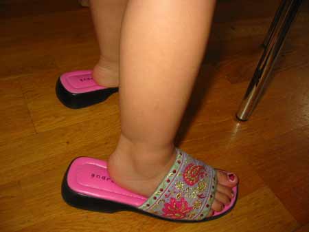 Les filles adorent ces savates que je trouve, moi, très laides. Elles se battent pour les porter et la dernière n’est pas en reste.